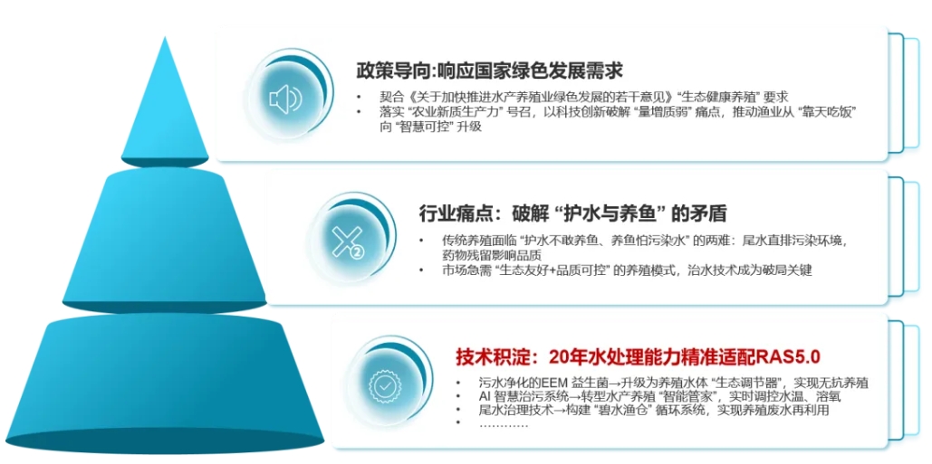從治水到養(yǎng)魚,商達公用的轉(zhuǎn)型發(fā)展是基于政策、行業(yè)、技術(shù)三重驅(qū)動,不是跨界跟風,而是優(yōu)勢延伸。20 年水處理技術(shù)為商達公用發(fā)展智慧漁業(yè)提供了深厚的技術(shù)積淀:污水凈化的EEM 益生菌可升級為養(yǎng)殖水體“生態(tài)調(diào)節(jié)器”,實現(xiàn)無抗養(yǎng)殖;AI 智慧治污系統(tǒng)可轉(zhuǎn)型水產(chǎn)養(yǎng)殖“智能管家”,實時調(diào)控水溫、溶氧;尾水治理技術(shù)可構(gòu)建“碧水漁倉” 循環(huán)系統(tǒng),實現(xiàn)養(yǎng)殖廢水再利用。通過“好水養(yǎng)好魚”,實現(xiàn)水生態(tài)價值化,推進從生態(tài)治理向生態(tài)價值化的產(chǎn)業(yè)升級戰(zhàn)略。