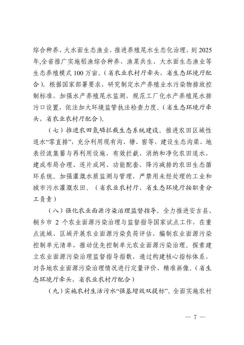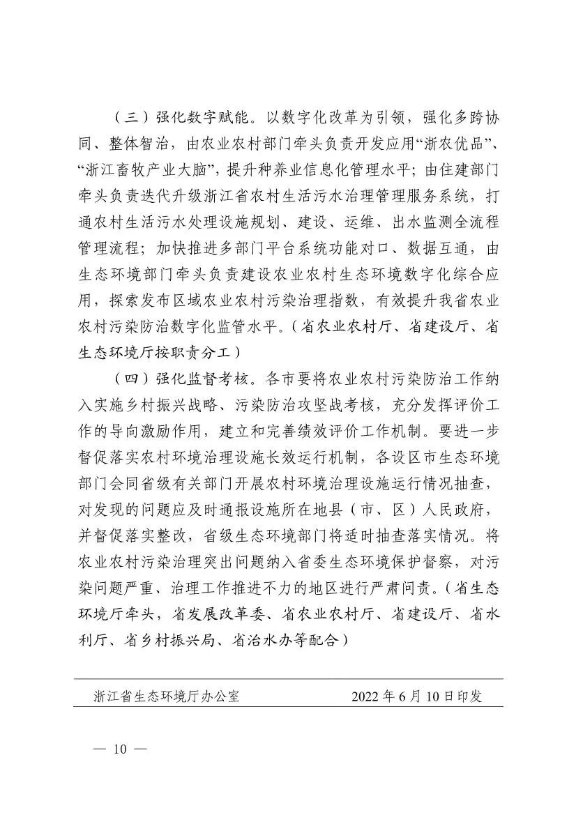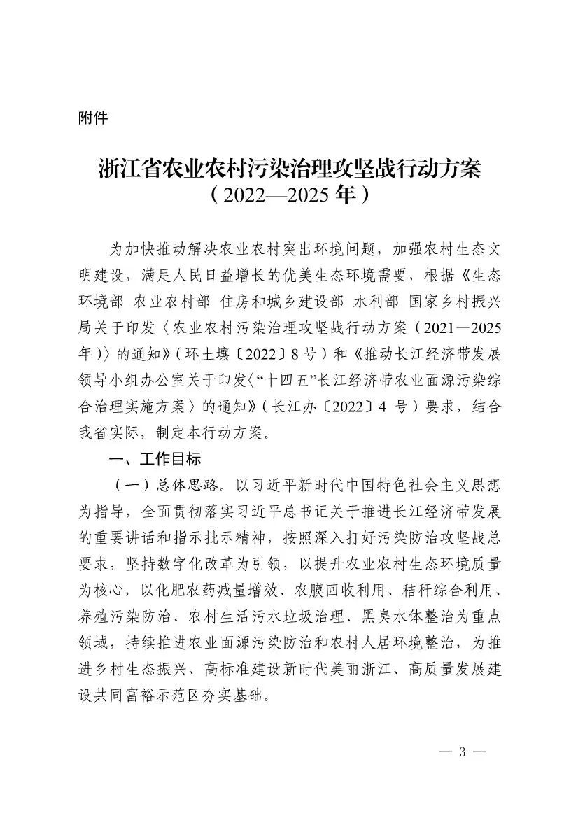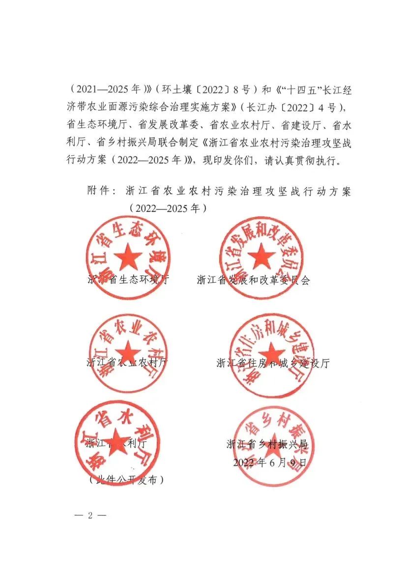 2022年6月9日,浙江省生態(tài)環(huán)境廳、浙江省發(fā)展改革委、浙江省農(nóng)業(yè)農(nóng)村廳等六部門聯(lián)合印發(fā)《浙江省農(nóng)業(yè)農(nóng)村污染治理攻堅(jiān)戰(zhàn)行動(dòng)方案(2022—2025年)》,要求到2025年,全省農(nóng)業(yè)面源污染得到初步管控,主要農(nóng)作物化肥、農(nóng)藥利用率均達(dá)到43%,農(nóng)藥廢棄包裝物、農(nóng)膜回收率均達(dá)到90%,畜禽養(yǎng)殖糞污資源化利用和無害化處理率達(dá)92%;全省新增農(nóng)村行政村環(huán)境整治1100個(gè),農(nóng)村生活污水治理率、達(dá)標(biāo)率達(dá)到95%,基本消除農(nóng)村黑臭水體。