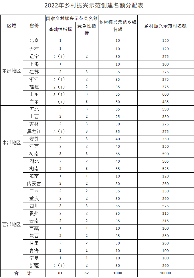 2022年,立足縣、鄉(xiāng)、村資源稟賦和發(fā)展基礎(chǔ),體現(xiàn)東、中、西部區(qū)域特色,農(nóng)業(yè)農(nóng)村部、國家鄉(xiāng)村振興局組織創(chuàng)建100個左右國家鄉(xiāng)村振興示范縣,省級農(nóng)業(yè)農(nóng)村部門、鄉(xiāng)村振興局組織創(chuàng)建1000個左右鄉(xiāng)村振興示范鄉(xiāng)鎮(zhèn)、10000個左右鄉(xiāng)村振興示范村,分層級推進(jìn)示范創(chuàng)建。力爭用5年左右時間,開展創(chuàng)建工作的國家鄉(xiāng)村振興示范縣基本覆蓋全國各市(地、州、盟)。各地要結(jié)合年度重點工作部署,扎實推進(jìn)示范創(chuàng)建工作。