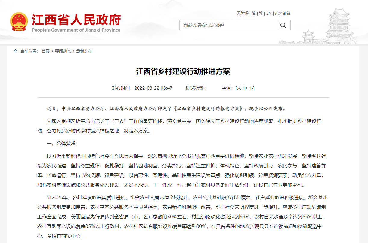 近日,中共江西省委辦公廳、江西省人民政府辦公廳印發(fā)了《江西省鄉(xiāng)村建設(shè)行動推進方案》。