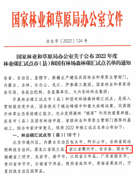 近日,國家林業(yè)和草原局辦公室公布了2022年度林業(yè)碳匯試點市(縣)名單。經(jīng)各市(縣)及國有林場申報、省級林草主管部門推薦,全國共18個市(縣)和21個國有林場入選。浙江省衢州市、安吉縣、麗水市成功入選林業(yè)碳匯試點市(縣)建設名單。