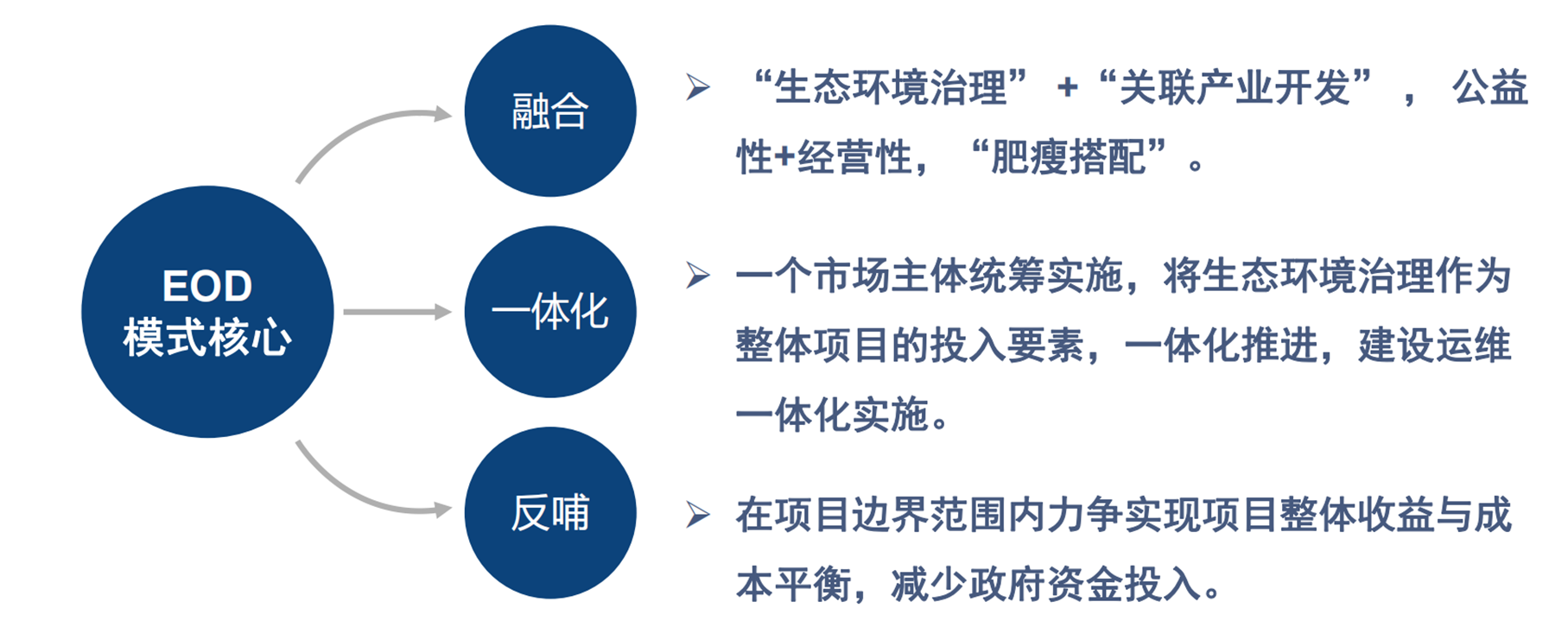 生態(tài)環(huán)境導(dǎo)向的開發(fā)模式(簡稱EOD模式)是以生態(tài)文明建設(shè)為引領(lǐng),以可持續(xù)發(fā)展為目標,以生態(tài)保護和環(huán)境治理為基礎(chǔ),以特色產(chǎn)業(yè)運營為支撐,以區(qū)域綜合開發(fā)為載體,采取產(chǎn)業(yè)鏈延伸、聯(lián)合經(jīng)營、組合開發(fā)等方式,推動公益性較強、收益性差的生態(tài)環(huán)境治理項目與收益較好的關(guān)聯(lián)產(chǎn)業(yè)有效融合,統(tǒng)籌推進,一體化實施,將生態(tài)環(huán)境治理帶來的經(jīng)濟價值內(nèi)部化,創(chuàng)新性的項目組織實施方式。