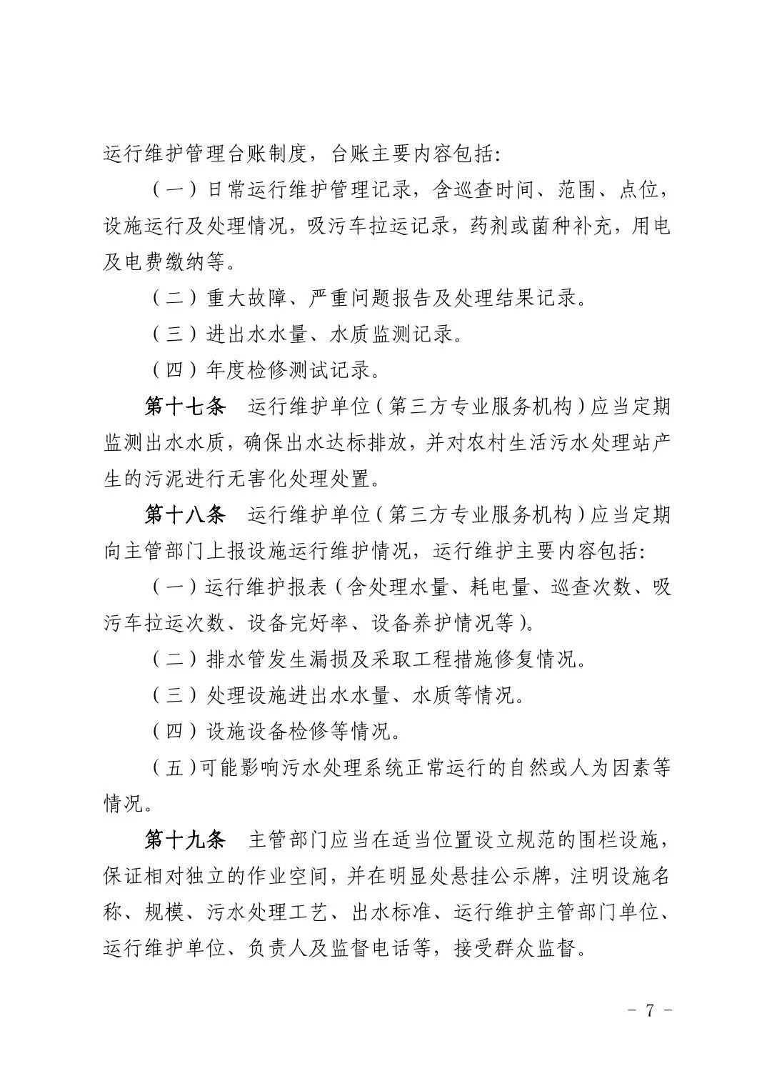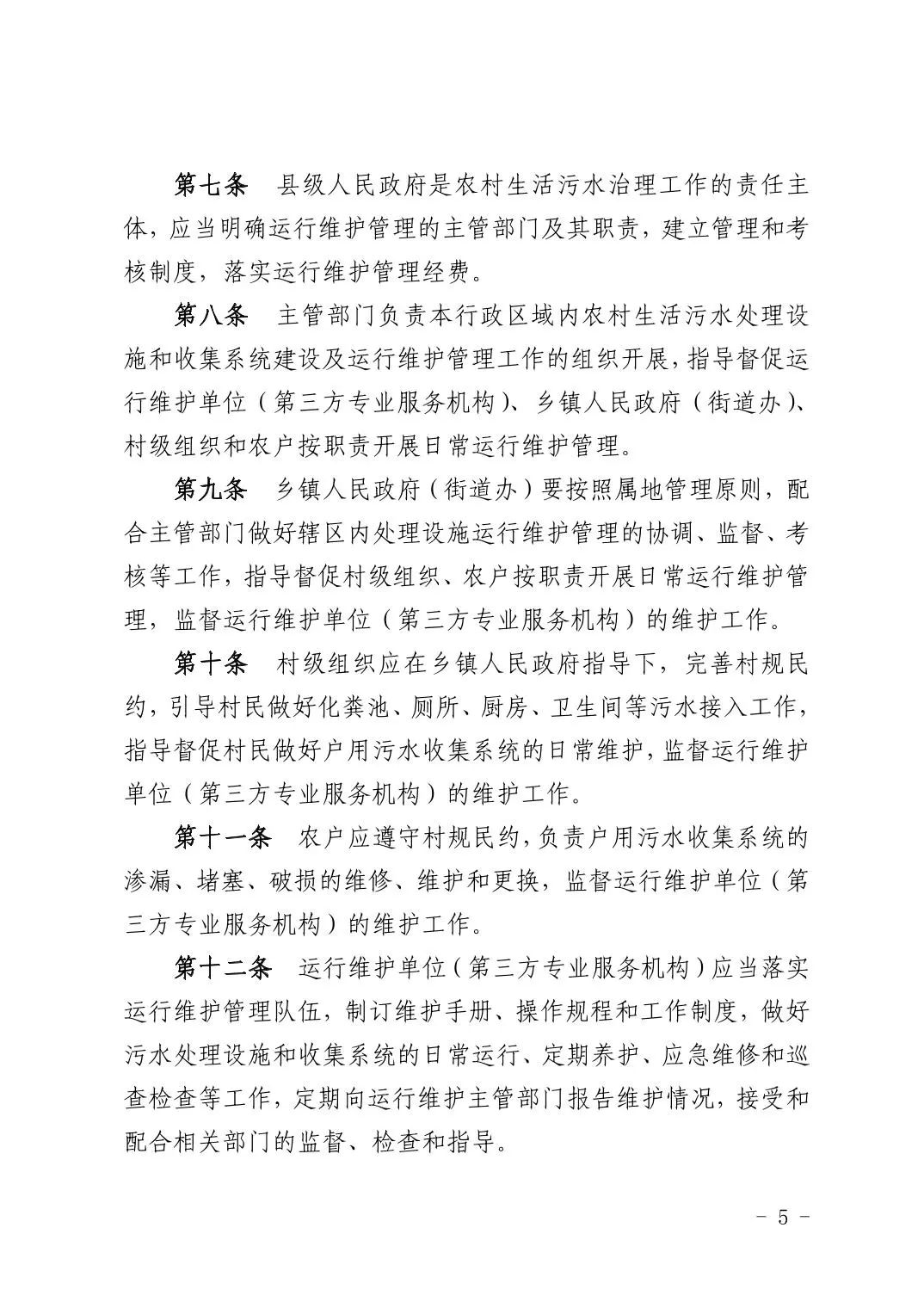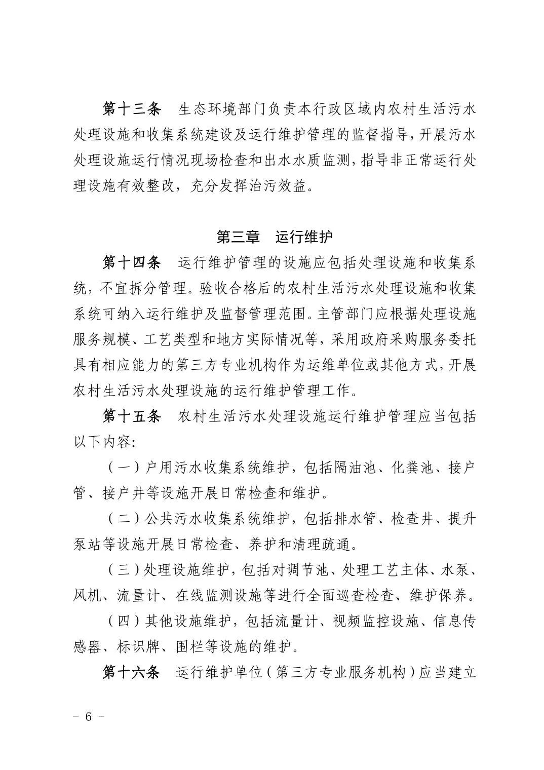 《辦法》明確了各部門職責(zé)分工,在運行維護、資金保障、監(jiān)督考核等方面提出了規(guī)范要求。明確建立健全以縣級人民政府為責(zé)任主體、主管部門為管理主體、鄉(xiāng)鎮(zhèn)人民政府和村級組織為協(xié)管主體、農(nóng)戶為受益主體、運行維護單位為服務(wù)主體、生態(tài)環(huán)境部門為監(jiān)管主體的“六位一體”農(nóng)村生活污水處理設(shè)施運行維護管理體系。
