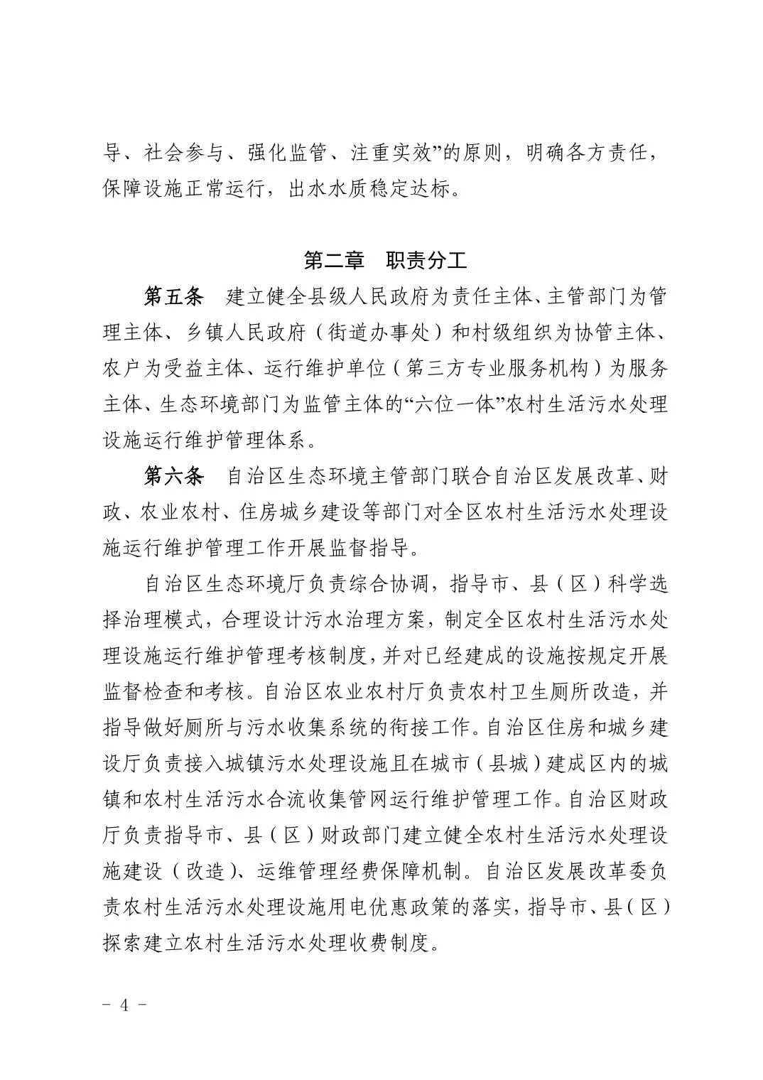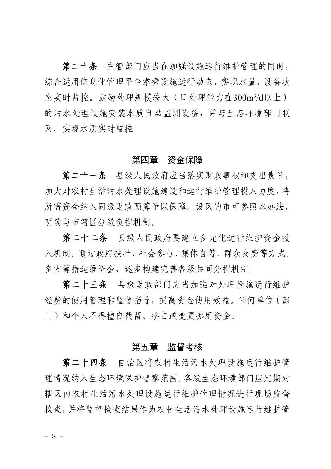 在資金運維上,《辦法》規(guī)定由自治區(qū)財政廳負(fù)責(zé)指導(dǎo)市、縣(區(qū))財政部門建立健全農(nóng)村生活污水處理設(shè)施建設(shè)或改造、運維管理經(jīng)費保障機制;縣級人民政府應(yīng)當(dāng)加大對農(nóng)村生活污水處理設(shè)施建設(shè)和運行維護管理投入力度,將所需資金納入同級財政預(yù)算予以保障,建立多元化運行維護資金投入機制,通過政府扶持、社會參與、集體自籌、群眾交費等方式,多方籌措運維資金,逐步構(gòu)建完善各級共同分擔(dān)機制,任何單位(部門)和個人不得擅自截留、擠占或變更挪用資金。