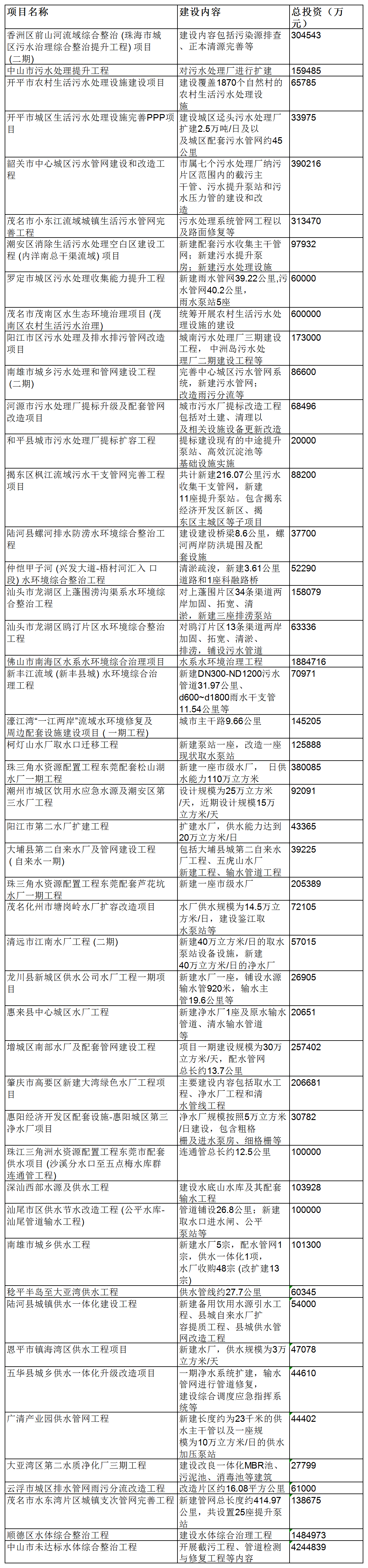 3月20日,廣東省發(fā)改委發(fā)布《廣東省發(fā)展改革委關(guān)于下達(dá)廣東省2023年重點(diǎn)建設(shè)項(xiàng)目計(jì)劃的通知》,2023年廣東省共安排省重點(diǎn)項(xiàng)目1530個(gè),總投資8.5萬億元,年度計(jì)劃投資1萬億元;安排開展前期工作的省重點(diǎn)建設(shè)前期預(yù)備項(xiàng)目1090個(gè),估算總投資4.6萬億元。其中涉及村鎮(zhèn)污水處理、污水處理廠、水環(huán)境綜合治理、供水等水環(huán)保項(xiàng)目50余個(gè),包括: