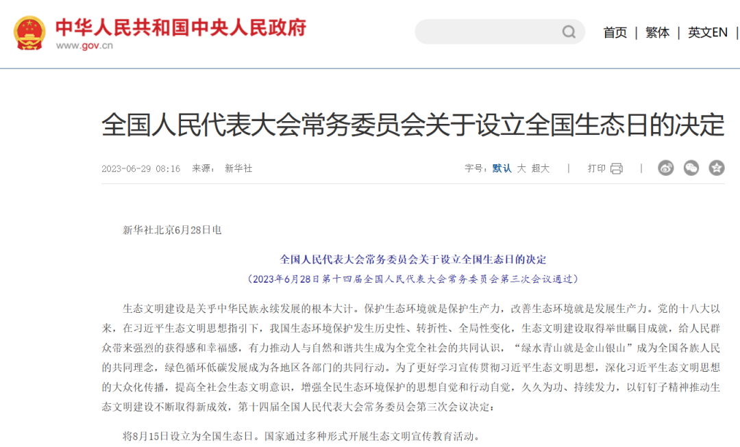2023年8月15日,是我國(guó)首個(gè)全國(guó)生態(tài)日。這一天,也是習(xí)近平總書(shū)記在浙江安吉考察時(shí)首次提出“綠水青山就是金山銀山”的科學(xué)論斷的紀(jì)念日。這一論斷是習(xí)近平生態(tài)文明思想的核心理念,也是指導(dǎo)中國(guó)生態(tài)文明建設(shè)的重要原則。全國(guó)生態(tài)日的由來(lái)全國(guó)生態(tài)日的設(shè)立是由浙江省人大代表團(tuán)提出的議案,經(jīng)過(guò)全國(guó)人大常委會(huì)審議通過(guò)。這是我國(guó)第一個(gè)以決定形式設(shè)立的綜合性活動(dòng)日,也是我國(guó)第一個(gè)以“全國(guó)”命名的活動(dòng)日。將8月15日設(shè)立為全國(guó)生態(tài)日,比較符合確定紀(jì)念日、活動(dòng)日時(shí)間的基本原則,能夠充分體現(xiàn)首創(chuàng)性、標(biāo)志性、獨(dú)特性。8月15日正是習(xí)近平總書(shū)記在浙江工作期間,2005年考察湖州市安吉縣時(shí)首次提出“綠水青山就是金山銀山”的科學(xué)論斷。這一論斷是習(xí)近平生態(tài)文明思想的核心理念。習(xí)近平總書(shū)記曾多次強(qiáng)調(diào),“綠水青山就是金山銀山”不僅是一種理念,更是一種行動(dòng)。全國(guó)生態(tài)日的目的全國(guó)生態(tài)日的主要目的是更好地學(xué)習(xí)宣傳貫徹習(xí)近平生態(tài)文明思想,深化習(xí)近平生態(tài)文明思想的大眾化傳播,提高全社會(huì)生態(tài)文明意識(shí),增強(qiáng)全民生態(tài)環(huán)境保護(hù)的思想自覺(jué)和行動(dòng)自覺(jué),久久為功、持續(xù)發(fā)力,以釘釘子精神推動(dòng)生態(tài)文明建設(shè)不斷取得新成效。習(xí)近平總書(shū)記指出,“建設(shè)美麗中國(guó)、實(shí)現(xiàn)中華民族偉大復(fù)興,需要我們一代代人接力奮斗”。 全國(guó)生態(tài)日的設(shè)立,有利于激發(fā)全社會(huì)對(duì)美麗中國(guó)建設(shè)的責(zé)任感和使命感,引導(dǎo)廣大人民群眾積極參與到生態(tài)文明建設(shè)中來(lái),形成人與自然和諧共生、共同發(fā)展、共享未來(lái)的良好局面。全國(guó)生態(tài)日的內(nèi)容全國(guó)生態(tài)日的主要內(nèi)容是通過(guò)多種形式開(kāi)展生態(tài)文明宣傳教育活動(dòng),包括舉辦主題宣傳活動(dòng)、開(kāi)展環(huán)境保護(hù)志愿服務(wù)、組織生態(tài)文明知識(shí)競(jìng)賽、展示生態(tài)文明建設(shè)成果、推廣綠色低碳生活方式等。全國(guó)生態(tài)日的首次實(shí)施將于2023年8月15日開(kāi)始,屆時(shí)將有一系列相關(guān)活動(dòng)舉行。首個(gè)全國(guó)生態(tài)日,國(guó)家發(fā)展改革委將會(huì)同中央宣傳部、自然資源部、生態(tài)環(huán)境部等部門(mén)和浙江省人民政府在浙江省湖州市舉辦首個(gè)全國(guó)生態(tài)日主場(chǎng)活動(dòng)。此外,還將有各地區(qū)各部門(mén)各單位根據(jù)實(shí)際情況,開(kāi)展各具特色的生態(tài)文明宣傳教育活動(dòng),讓全國(guó)生態(tài)日成為一場(chǎng)全民參與、共同學(xué)習(xí)、共同行動(dòng)的生態(tài)文明盛會(huì)。全國(guó)生態(tài)日標(biāo)識(shí)(全國(guó)生態(tài)日標(biāo)識(shí),來(lái)源:國(guó)家發(fā)改委)
