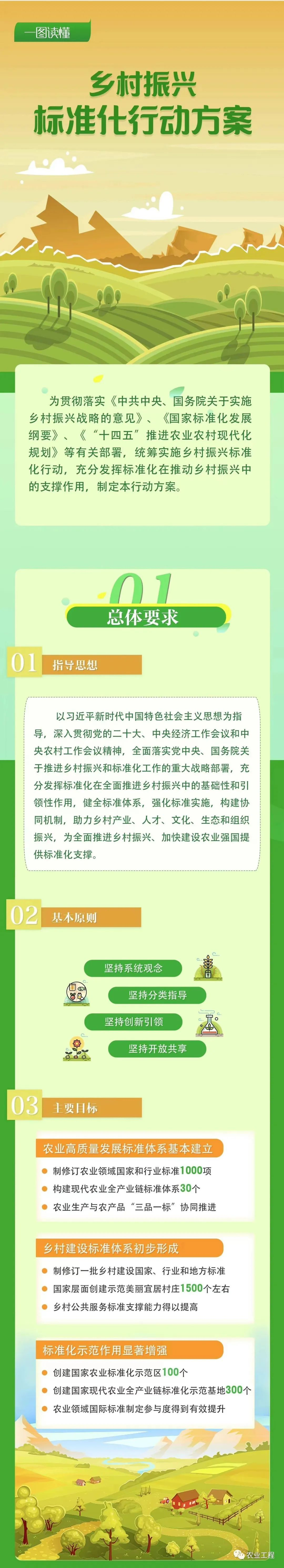 總的目標(biāo)就是,到2025年,農(nóng)業(yè)農(nóng)村高質(zhì)量發(fā)展標(biāo)準(zhǔn)體系基本建立,標(biāo)準(zhǔn)化推廣服務(wù)體系基本建成,農(nóng)業(yè)農(nóng)村標(biāo)準(zhǔn)的國際化程度顯著提高,標(biāo)準(zhǔn)化協(xié)調(diào)推進(jìn)機(jī)制基本形成。