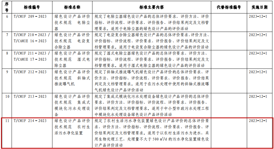 2023年10月10日,根據(jù)《中國機(jī)械工業(yè)聯(lián)合會(huì)團(tuán)體標(biāo)準(zhǔn)管理辦法》和《中國機(jī)械工業(yè)聯(lián)合會(huì)團(tuán)體標(biāo)準(zhǔn)制定工作細(xì)則》的有關(guān)規(guī)定,中國機(jī)械工業(yè)聯(lián)合會(huì)批準(zhǔn)17項(xiàng)中國機(jī)械工業(yè)聯(lián)合會(huì)團(tuán)體標(biāo)準(zhǔn)。由商達(dá)公用起草主編的T/CMIF 214-2023《綠色設(shè)計(jì)產(chǎn)品評(píng)價(jià)技術(shù)規(guī)范 農(nóng)村生活污水凈化裝置》名列榜單,自2023年12月1日起正式實(shí)施。
