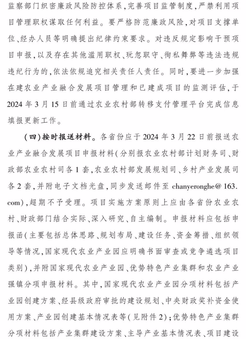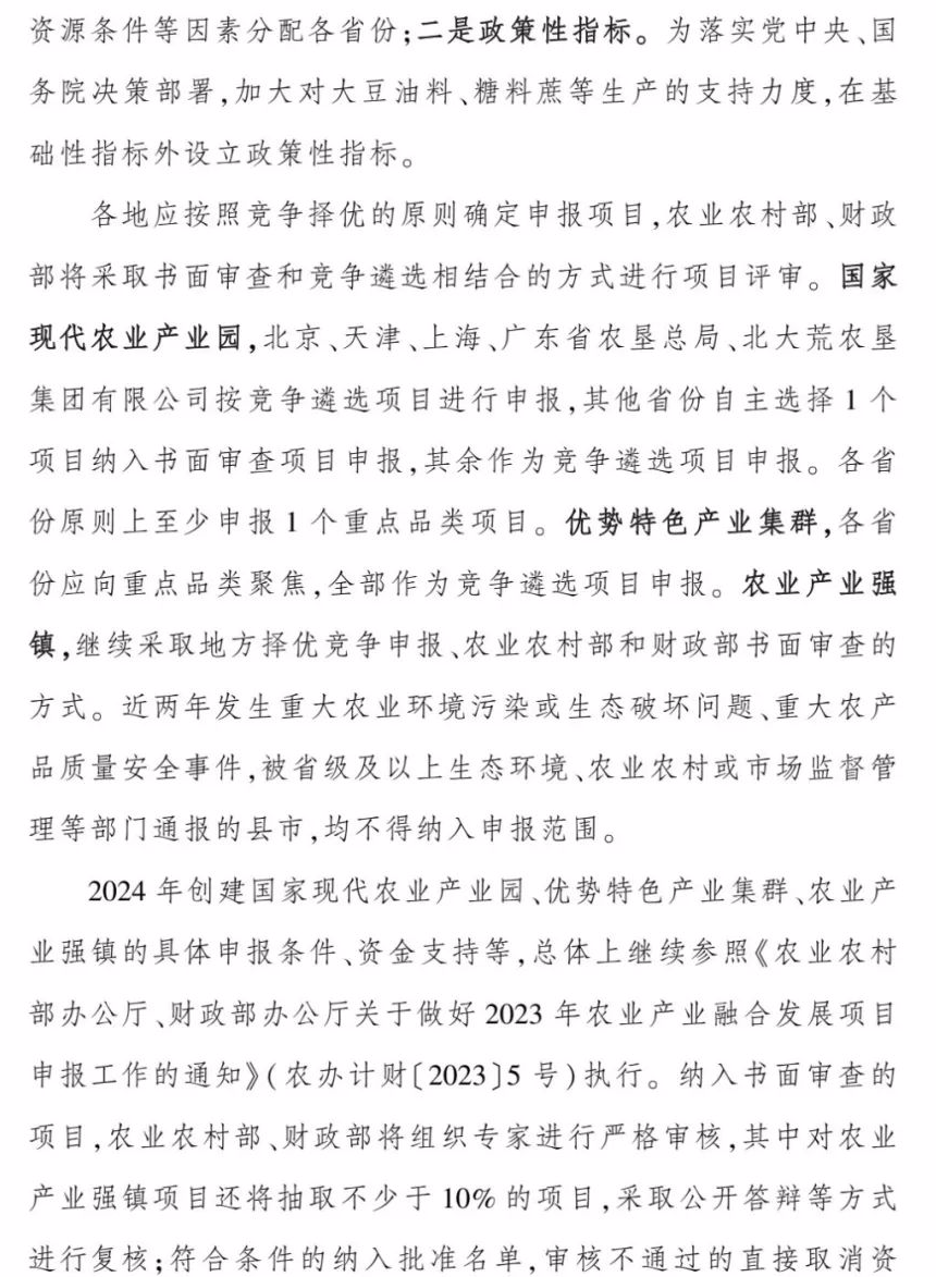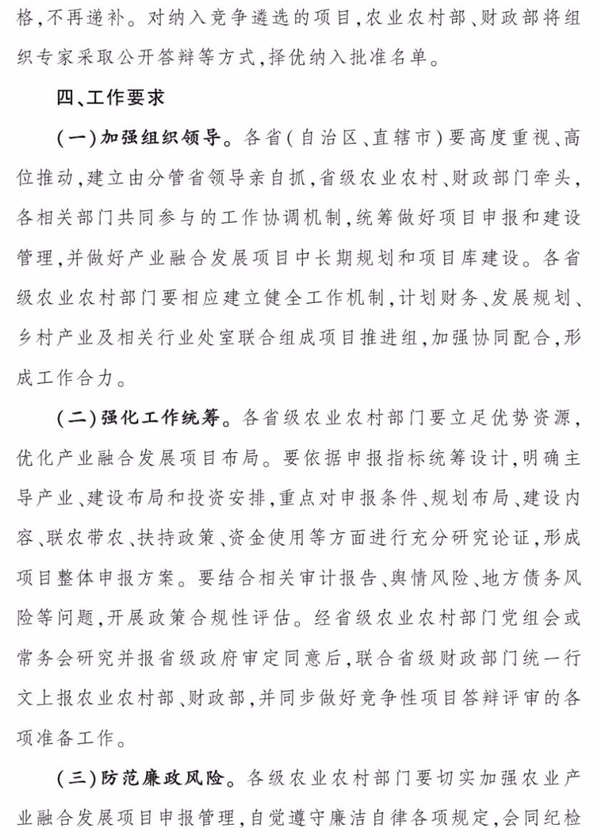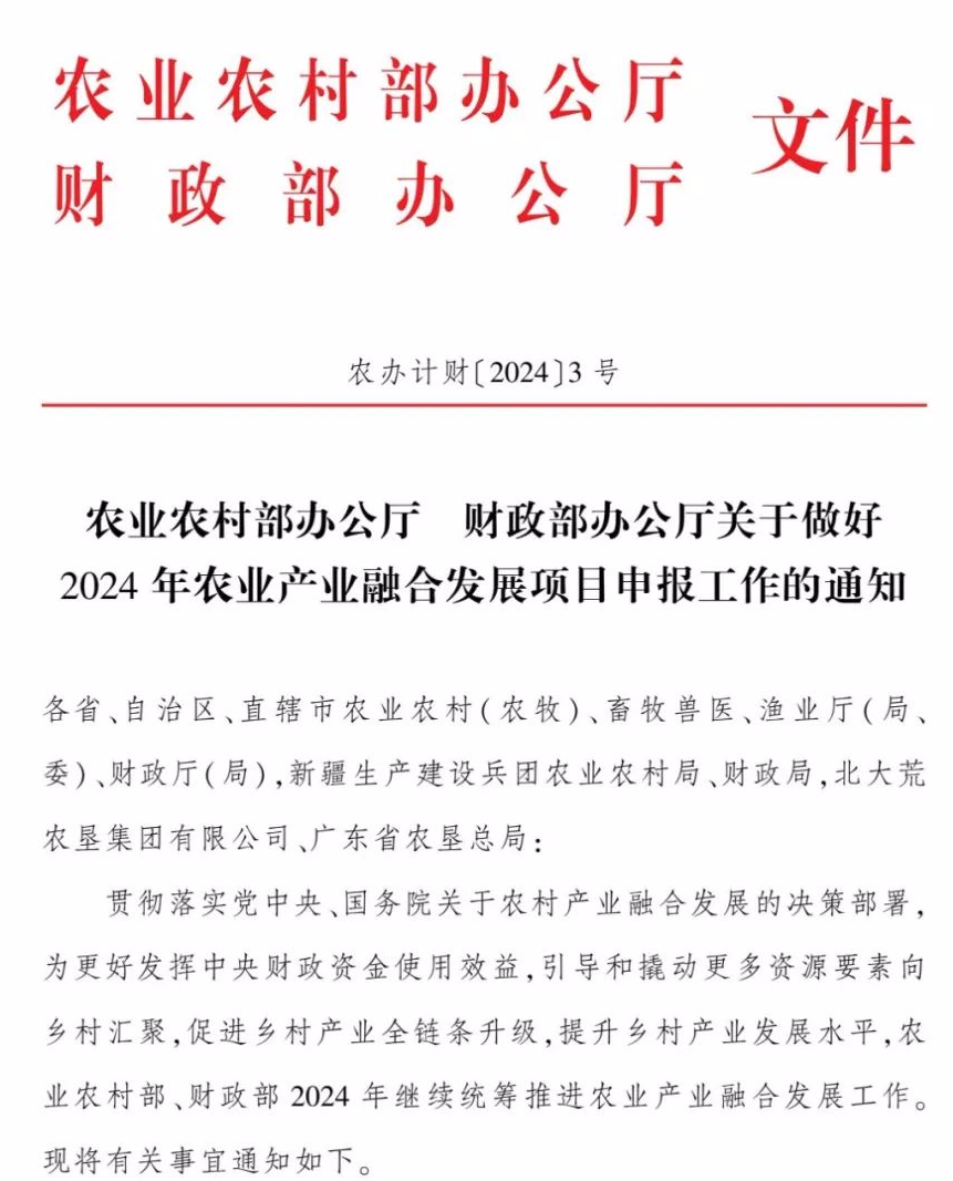 為更好發(fā)揮中央財政資金使用效益,引導(dǎo)和撬動更多資源要素向鄉(xiāng)村匯聚,促進(jìn)鄉(xiāng)村產(chǎn)業(yè)全鏈條升級,提升鄉(xiāng)村產(chǎn)業(yè)發(fā)展水平,農(nóng)業(yè)農(nóng)村部、財政部2024年繼續(xù)統(tǒng)籌推進(jìn)農(nóng)業(yè)產(chǎn)業(yè)融合發(fā)展工作,具體申報通知如下: