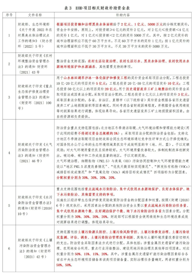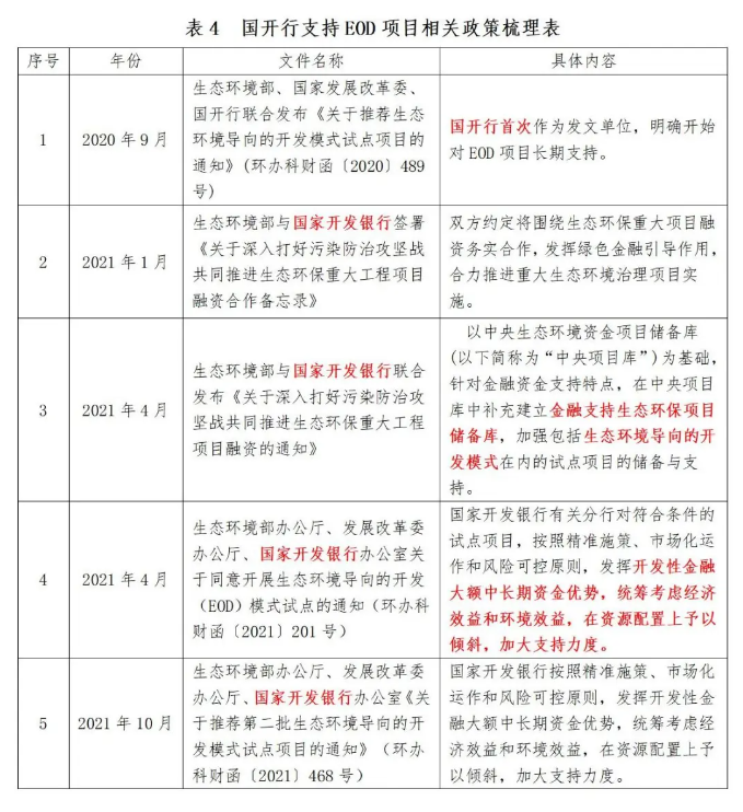 通過梳理我國近年來的政策文件,結(jié)合EOD項目申報范圍,補助資金的具體內(nèi)容如下表:EOD項目融資資金可通過:政策性銀行融資、商業(yè)銀行融資、政府債券、綠色基金等方式籌集項目資金。其中以政策性銀行融資為主要方式。政策性銀行關(guān)于支持我國EOD項目的相關(guān)政策內(nèi)容整理如下:自2020年與生態(tài)環(huán)境部、國家發(fā)展改革委聯(lián)合推動開展生態(tài)環(huán)境導(dǎo)向的開發(fā)模式(EOD)試點工作以來,截至2022年底,國家開發(fā)銀行已向25個試點項目發(fā)放貸款225億元,涉及水生態(tài)環(huán)境保護、廢舊資源再生利用、農(nóng)業(yè)農(nóng)村污染治理、生態(tài)保護修復(fù)等多個領(lǐng)域。EOD模式是加強生態(tài)環(huán)保投融資、推進生態(tài)產(chǎn)業(yè)價值實現(xiàn)的重要探索。據(jù)統(tǒng)計,國家開發(fā)銀行支持生態(tài)環(huán)境部EOD試點項目的個數(shù)、金額均居同業(yè)首位。
