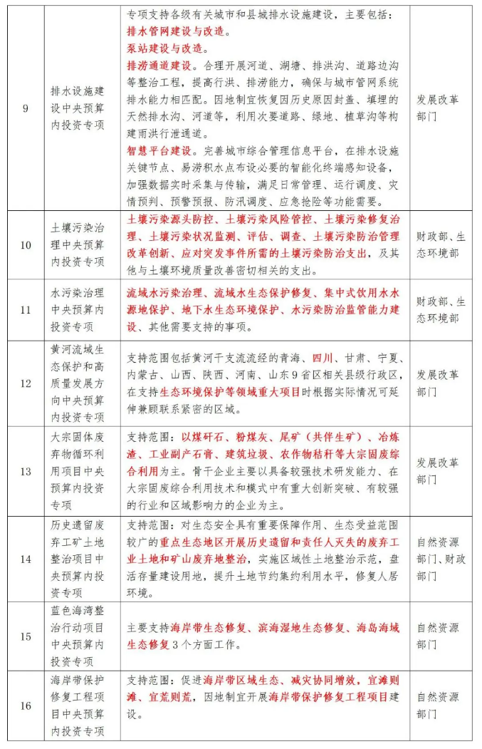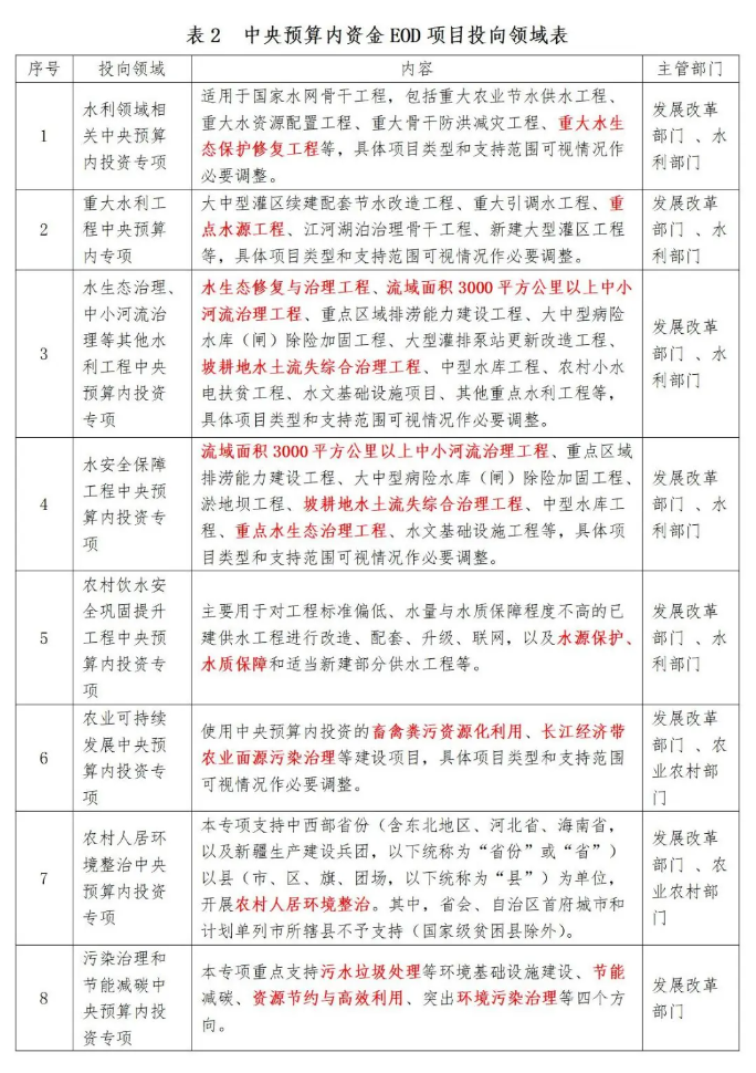 根據(jù)《政府投資條例》,中央預(yù)算內(nèi)投資資金的安排方式包括直接投資、資本金注入、投資補助、貸款貼息等。2020-2022年,中央預(yù)算總盤子投資計劃分別為6000億、6100億、6400億。2023年,中央預(yù)算內(nèi)資金支持的投向領(lǐng)域有37個,與EOD項目建設(shè)內(nèi)容相契合的有16個,具體見下表: